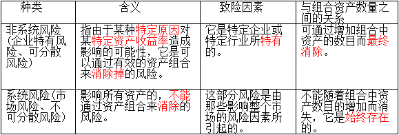 【提示1】可以通過增加組合中資產(chǎn)的數(shù)目而最終消除的風(fēng)險被稱為非系統(tǒng)風(fēng)險,而那些反映資產(chǎn)之間相互關(guān)系,共同運動,無法最終消除的風(fēng)險被稱為系統(tǒng)風(fēng)險。