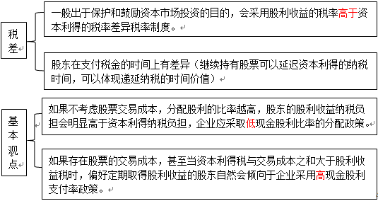 【提示】稅差理論說(shuō)明了當(dāng)股利收益稅率與資本利得稅率存在差異時(shí),將使股東在繼續(xù)持有股票以期取得預(yù)期資本利得與立即實(shí)現(xiàn)股利收益之間進(jìn)行權(quán)衡。