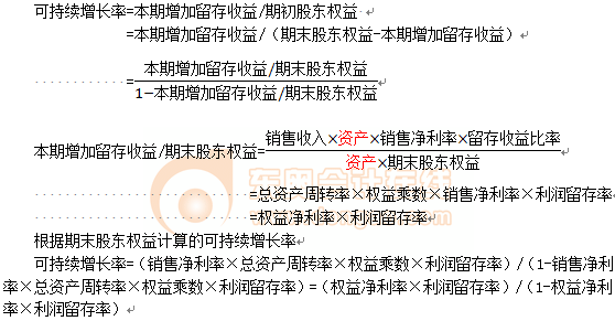 可持續(xù)增長(zhǎng)率=銷(xiāo)售凈利率×總資產(chǎn)周轉(zhuǎn)率×期初權(quán)益期末總資產(chǎn)乘數(shù)×收益留存率