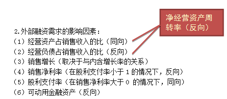 外部融資需求=增加的銷售收入×經(jīng)營資產(chǎn)銷售百分比-增加的銷售收入×經(jīng)營負債銷售百分比-可以動用的金融資產(chǎn)-預計銷售額×計劃銷售凈利率×(1-股利支付率)