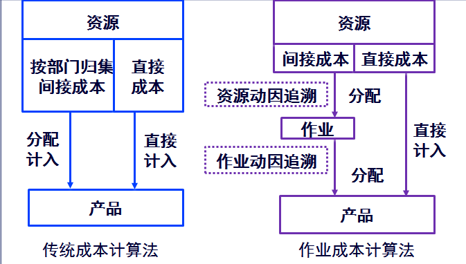 作業(yè)成本法的基本指導(dǎo)思想是,“作業(yè)消耗資源、產(chǎn)品(服務(wù)或顧客)消耗作業(yè)”。根據(jù)這一指導(dǎo)思想,作業(yè)成本法把成本計(jì)算過(guò)程劃分為兩個(gè)階段。 作業(yè)成本法下,間接成本的分配路徑是: “資源→作業(yè)→產(chǎn)品”; 傳統(tǒng)成本計(jì)算方法下,間接成本的分配路徑是: “資源→部門→產(chǎn)品”。 |