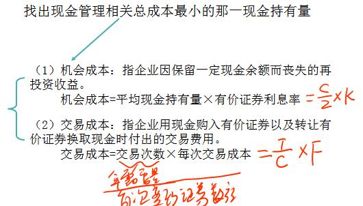 最佳現(xiàn)金持有量C是機(jī)會(huì)成本線與交易成本線交叉點(diǎn)所對(duì)應(yīng)的現(xiàn)金持有量。