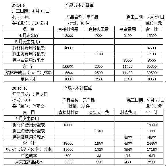 【例14-10】某企業(yè)按照購貨單位的要求,小批生產(chǎn)某些產(chǎn)品,采用分批法計(jì)算產(chǎn)品成本。該廠4月份投產(chǎn)甲產(chǎn)品10件,批號為401,5月份全部完工;5月份投產(chǎn)乙產(chǎn)品60件,批號為501,當(dāng)月完工40件,并已交貨,還有20件尚未完工。401批和501批產(chǎn)品成本計(jì)算單如表14-9和表14-10。各種費(fèi)用的歸集和分配過程省略。
