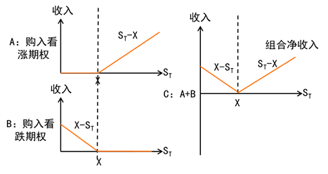 多頭對敲是指同時買進(jìn)一只股票的看漲期權(quán)和看跌期權(quán),它們的執(zhí)行價格、到期日都相同。
