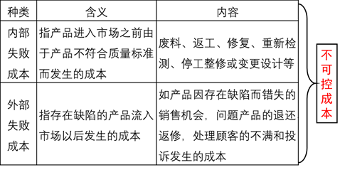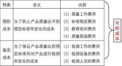 (2)一般來說,企業(yè)能夠控制預(yù)防成本和鑒定成本的支出,因此這兩種成本屬于可控質(zhì)量成本;而無論是內(nèi)部還是外部失敗成本,企業(yè)往往無法預(yù)料其發(fā)生,并且一旦產(chǎn)生失敗成本,其費用的多少往往不能在事前得到,因此失敗成本屬于不可控質(zhì)量成本。