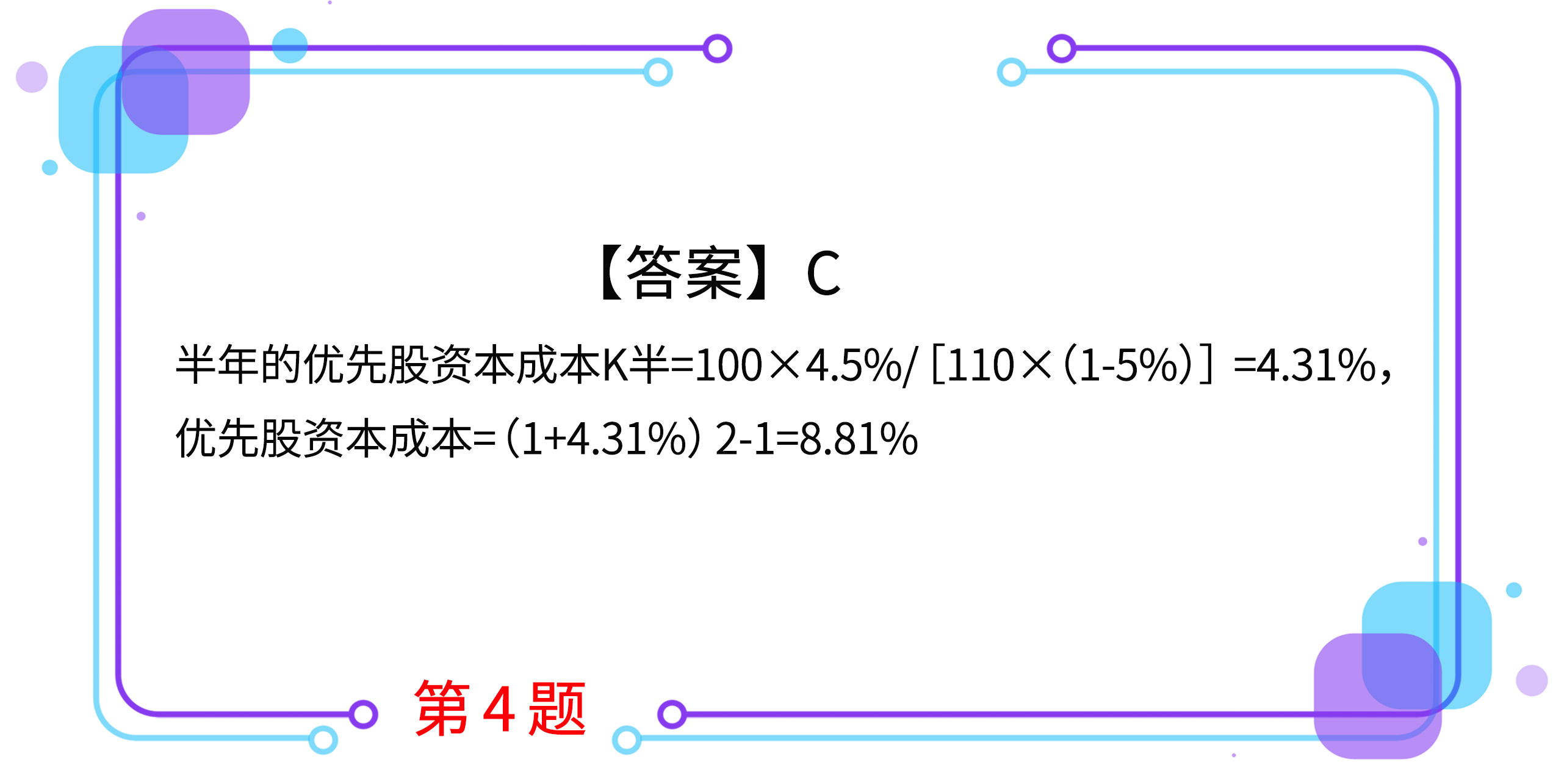 4.某企業(yè)經(jīng)批準溢價發(fā)行優(yōu)先股股票,每股面值100元,發(fā)行價格110元,發(fā)行費用率和年股息率分別為5%和9%,每半年支付一次股利,所得稅稅率為25%,則優(yōu)先股資本成本為( )。