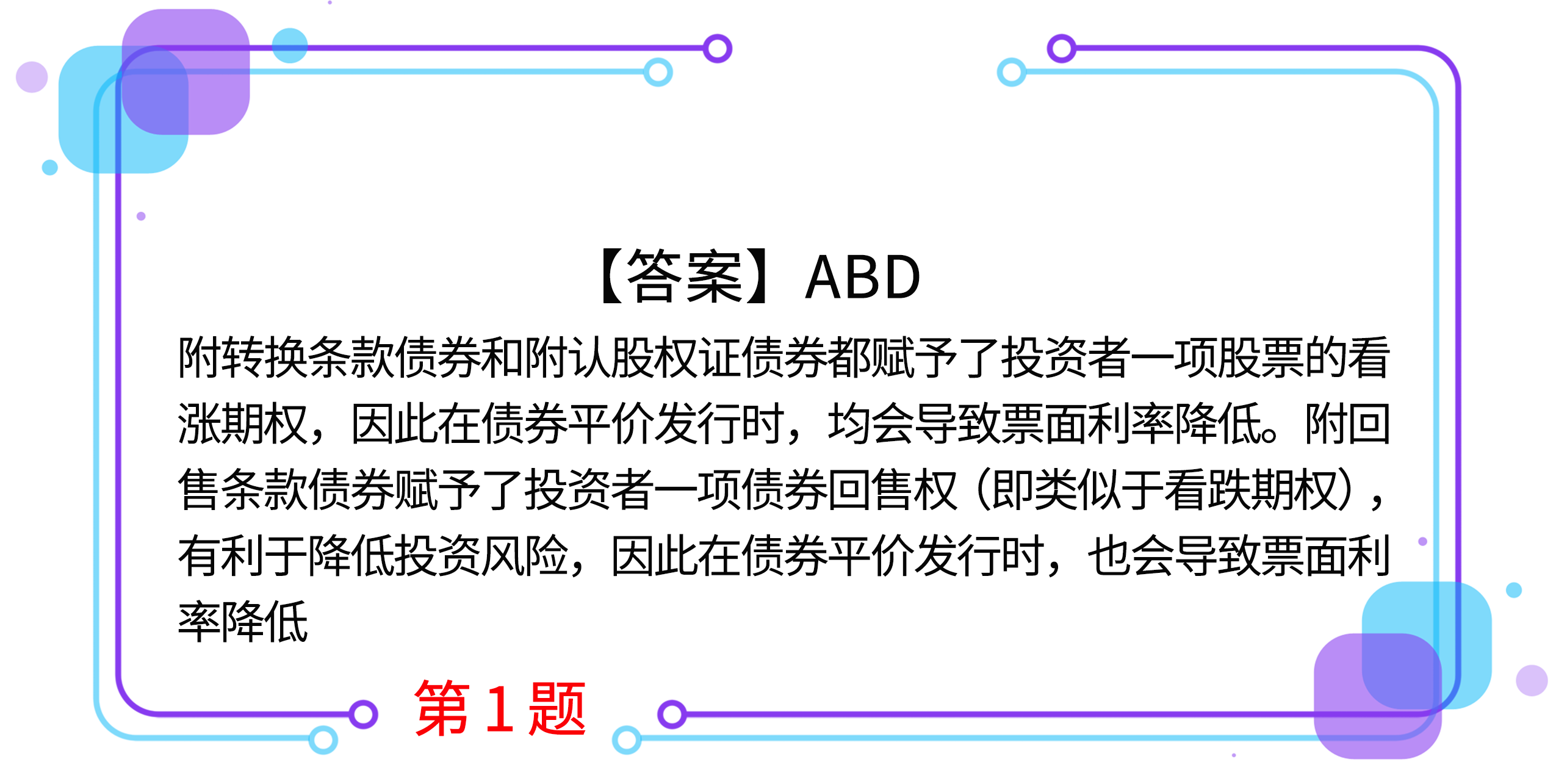 1.為確保債券平價發(fā)行,假設(shè)其他條件不變,下列各項可導(dǎo)致票面利率降低的有( )。(2019年)