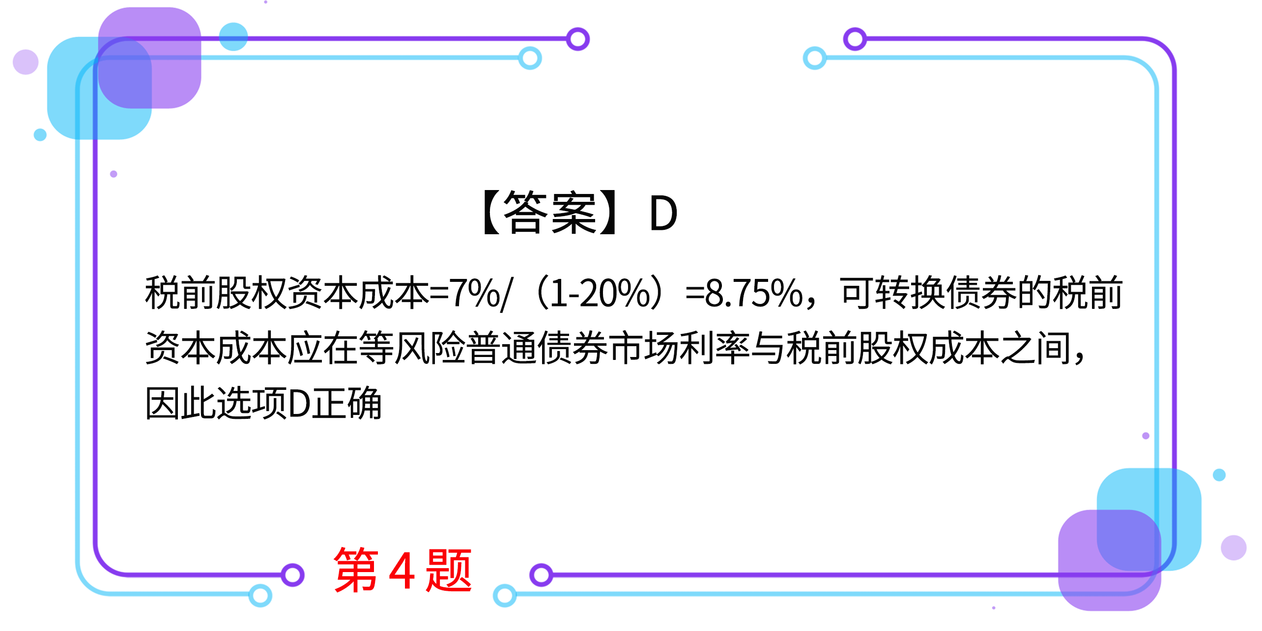 4.甲公司擬發(fā)行可轉(zhuǎn)換債券,當前等風險普通債券的市場利率為5%,股東權(quán)益成本為7%,甲公司的企業(yè)所得稅稅率為20%,要使發(fā)行方案可行,可轉(zhuǎn)換債券的稅前資本成本的區(qū)間為( )。