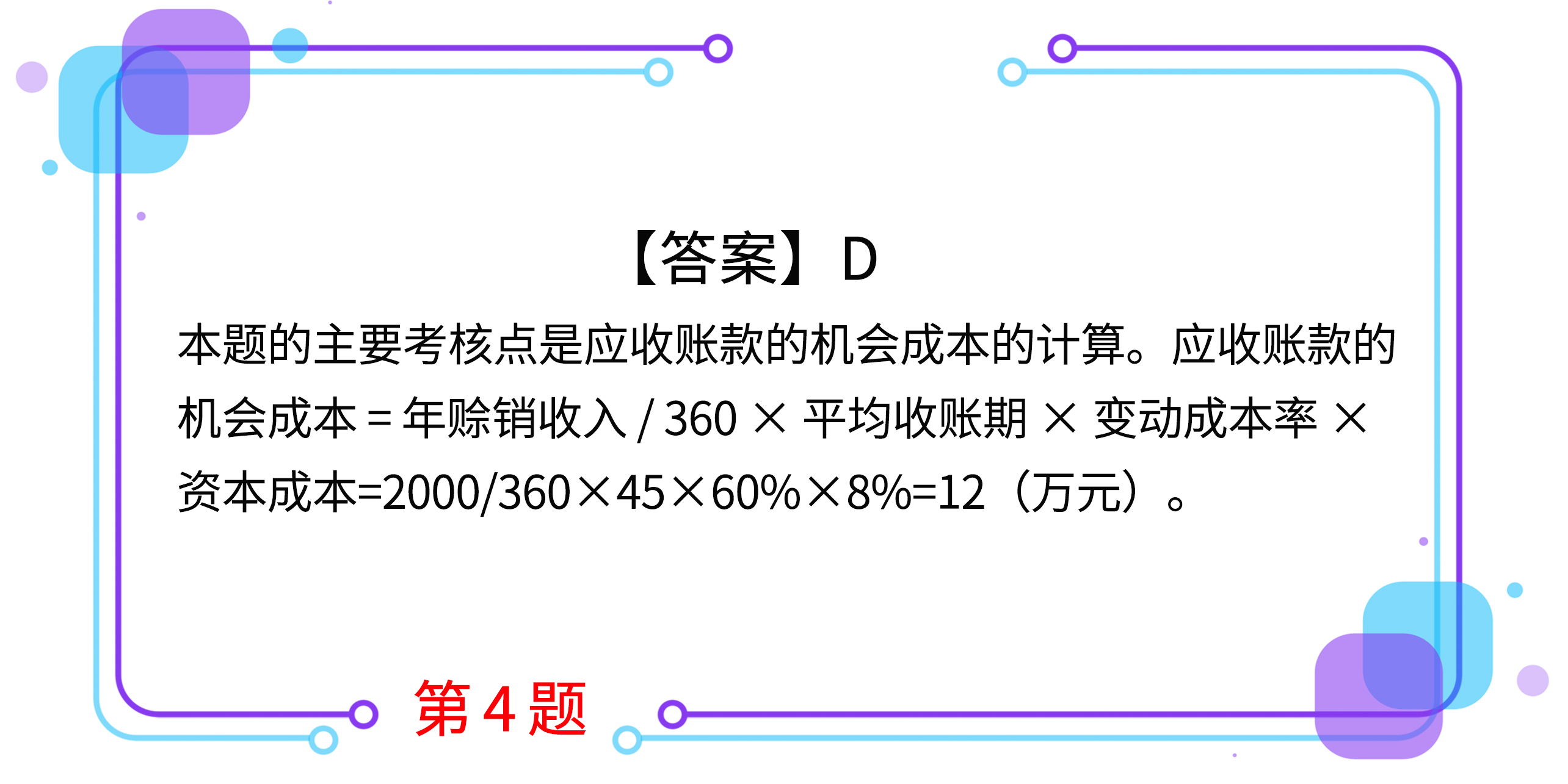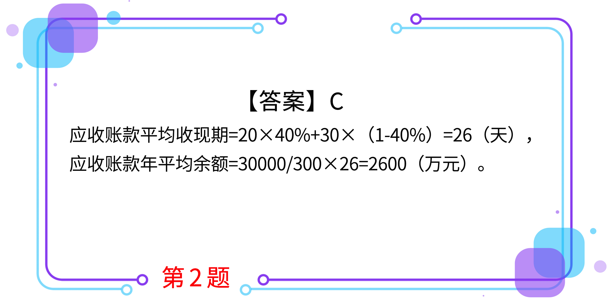 2.甲公司全年銷售額為30000萬元(一年按300天計算),信用政策是1/20、n/30,平均有40%的顧客(按銷售額計算)享受現(xiàn)金折扣優(yōu)惠,沒有顧客逾期付款。甲公司應(yīng)收賬款的年平均余額是( )萬元。