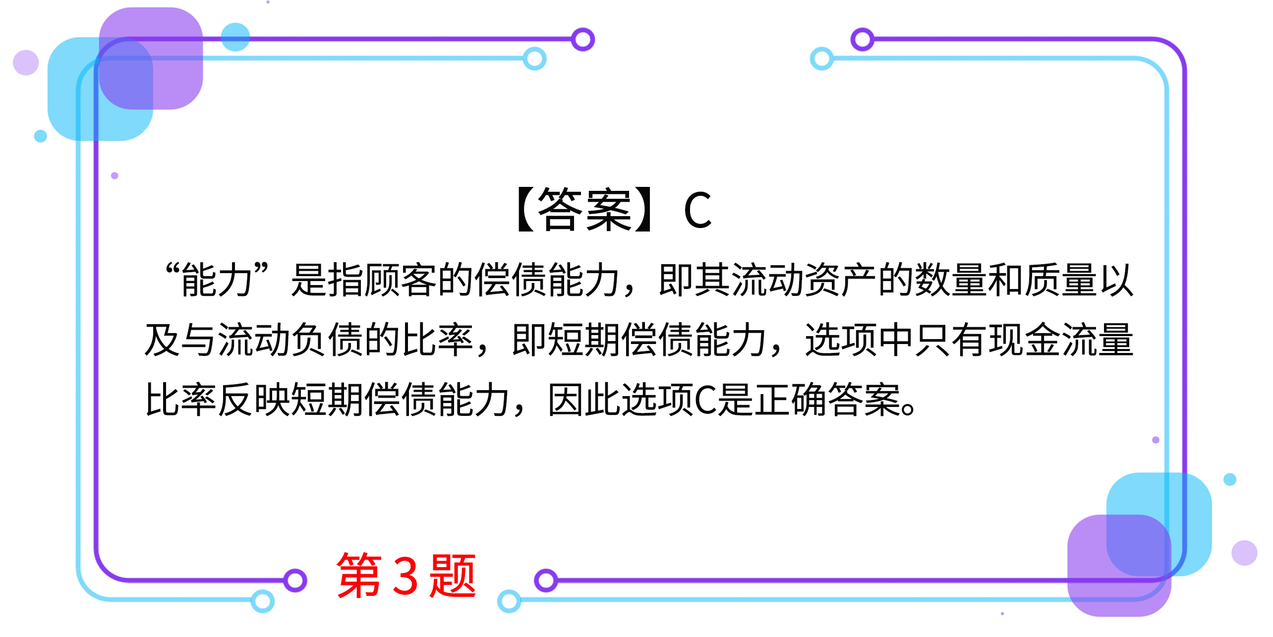 3.在依據(jù)“5C”系統(tǒng)原理確定信用標(biāo)準(zhǔn)時,應(yīng)掌握客戶“能力”方面的信息,下列各項(xiàng)指標(biāo)中最能反映客戶“能力”的是( )。