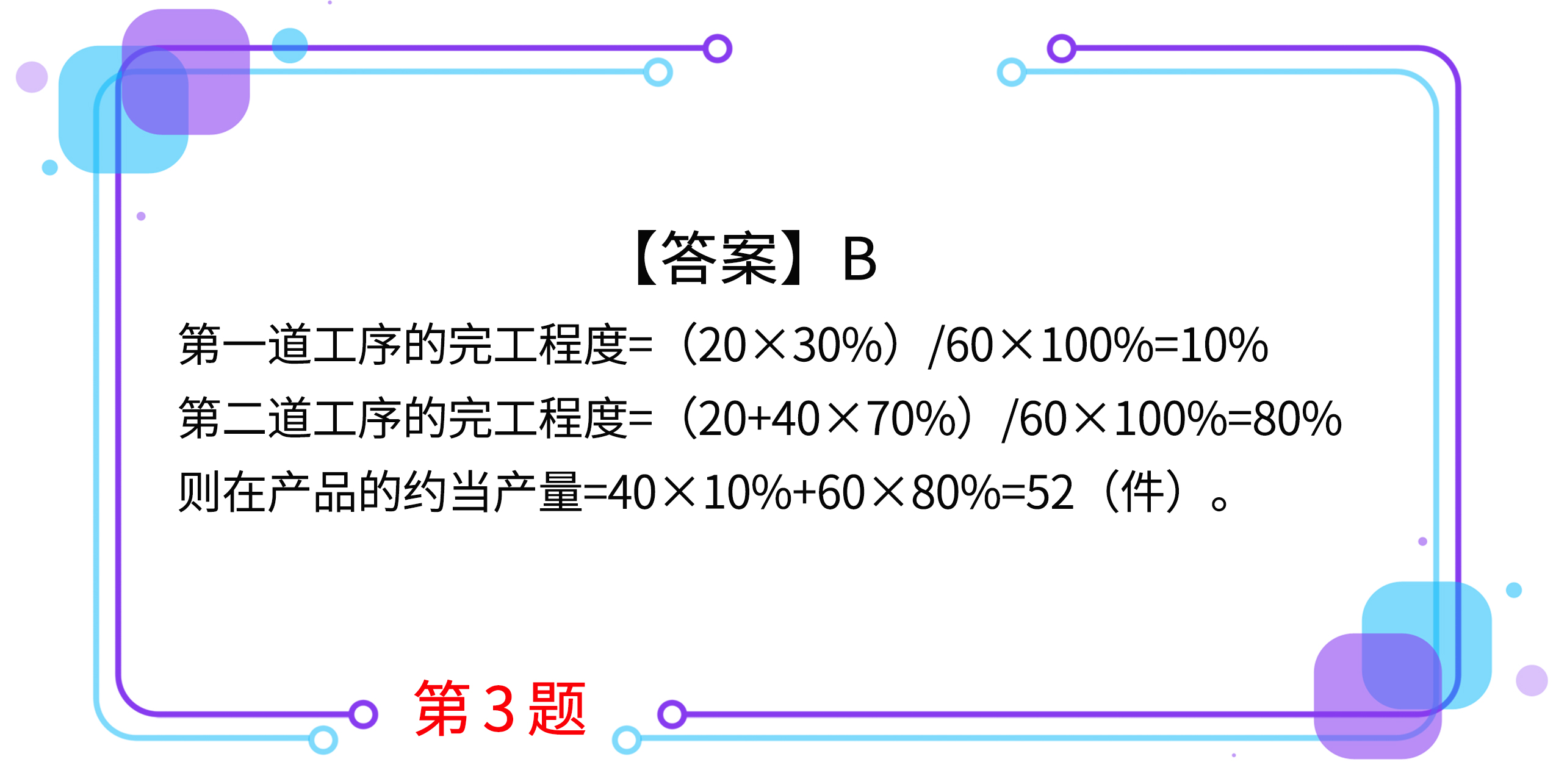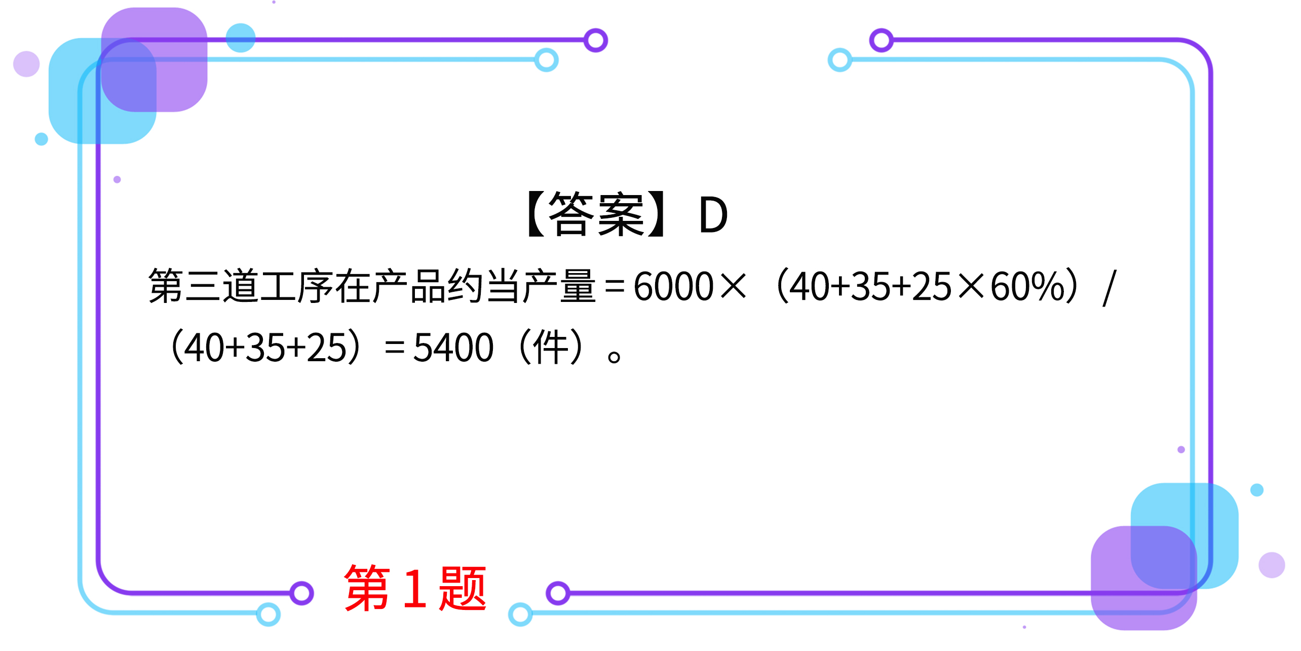 1.甲企業(yè)基本生產(chǎn)車間生產(chǎn)乙產(chǎn)品,依次經(jīng)過三道工序,工時定額分別為40小時、35小時和25小時。月末完工產(chǎn)品和在產(chǎn)品成本采用約當(dāng)產(chǎn)量法分配。假設(shè)制造費用隨加工進度在每道工序陸續(xù)均勻發(fā)生,各工序月末在產(chǎn)品平均完工程度60%,第三道工序月末在產(chǎn)品數(shù)量6000件。分配制造費用時,第三道工序在產(chǎn)品約當(dāng)產(chǎn)量是(  )件。(2018年第Ⅰ套)