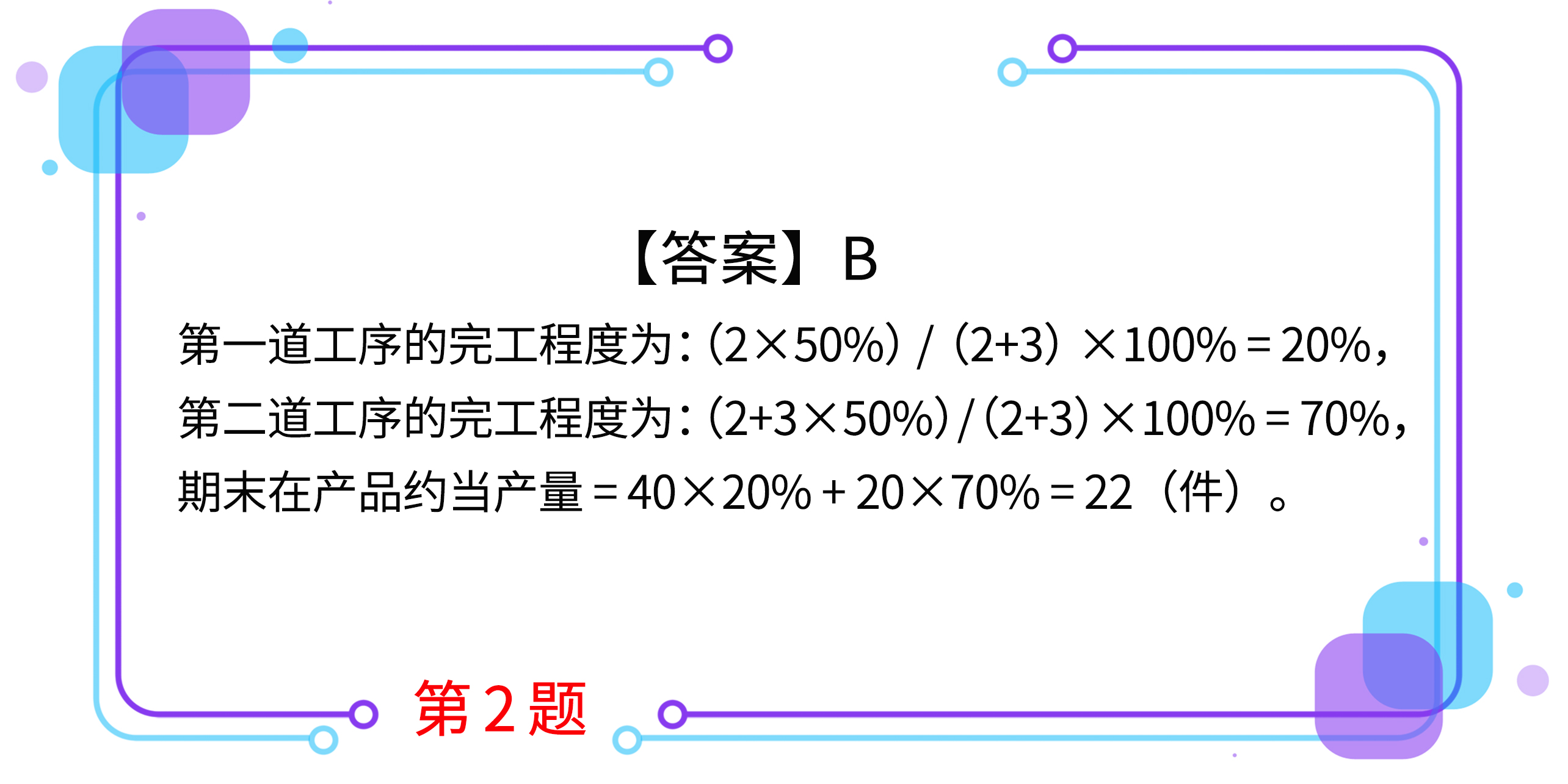 2.甲產(chǎn)品在生產(chǎn)過程中,需經(jīng)過兩道工序,第一道工序定額工時2小時,第二道工序定額工時3小時。期末,甲產(chǎn)品在第一道工序的在產(chǎn)品40件,在第二道工序的在產(chǎn)品20件。以定額工時作為分配計算在產(chǎn)品加工成本(不含原材料成本)的依據(jù),其期末在產(chǎn)品約當(dāng)產(chǎn)量為(  )件。
