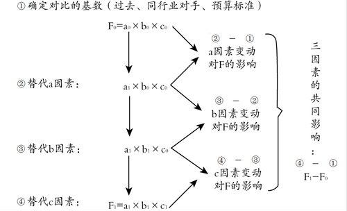 因素分析法 | 是依據(jù)財(cái)務(wù)指標(biāo)與其驅(qū)動因素之間的關(guān)系,從數(shù)量上確定各因素對指標(biāo)影響程度的一種方法 | (1)連環(huán)替代法 設(shè)F=a×b×c 基數(shù)(計(jì)劃、上年、同行業(yè)先進(jìn)水平) F0=a0×b0×c0 實(shí)際F1=a1×b1×c1