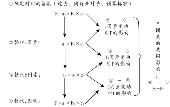 因素分析法 | 是依據(jù)財務指標與其驅(qū)動因素之間的關(guān)系,從數(shù)量上確定各因素對指標影響程度的一種方法 | (1)連環(huán)替代法 設F=a×b×c 基數(shù)(計劃、上年、同行業(yè)先進水平) F0=a0×b0×c0 實際F1=a1×b1×c1 (2)差額分析法 a因素變動對F的影響:(a1-a0)×b0×c0 b因素變動對F的影響:a1×(b1-b0)×c0 c因素變動對F的影響:a1×b1×(c1-c0) 注意連環(huán)替代的順序,一般題中都會有說明 |