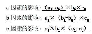 差額分析法只適用于當(dāng)綜合指標(biāo)等于各因素之間連乘時(shí);當(dāng)綜合指標(biāo)是通過因素間“加”或“減”形成時(shí),不能用差額分析法。
