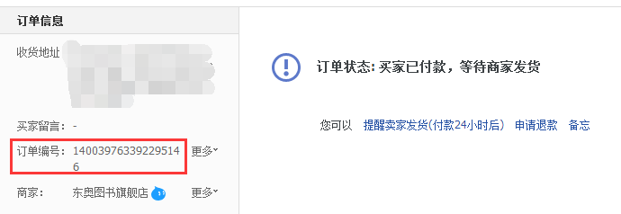 ①在天貓”東奧圖書旗艦店“下單成功后,保留”訂單編號“界面。