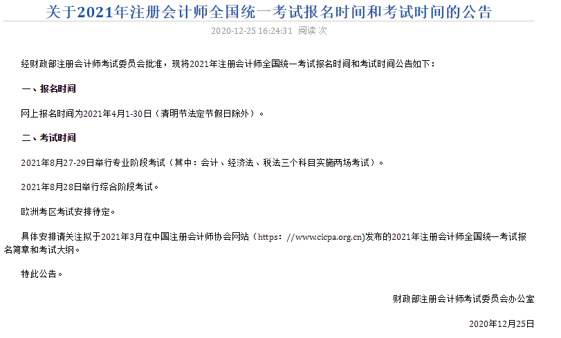 中國注冊(cè)會(huì)計(jì)師協(xié)會(huì)官方網(wǎng)站已經(jīng)發(fā)布2021年注會(huì)考試時(shí)間為8月27-29日。