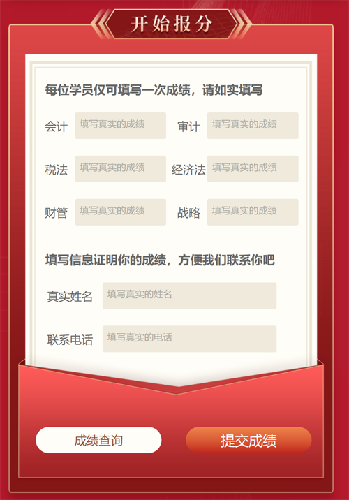 12月21日-1月22日期間,凡參與報(bào)分活動(dòng)的考生,需準(zhǔn)確填寫自己2020年注會(huì)考試成績。在這里需要注意的是:考生們每人只能填寫一次,在提交時(shí)考生們要注意檢查哦!