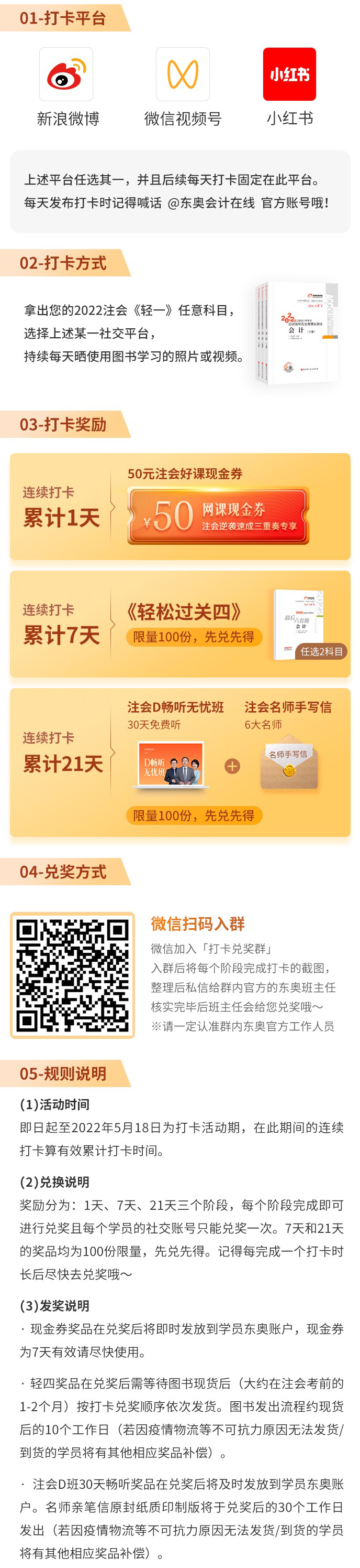 2022年注冊(cè)會(huì)計(jì)師備考已經(jīng)開始,輕一一如既往備受考生信賴!正所謂“鍥而不舍,金石可鏤。”成功需要日復(fù)一日的堅(jiān)持!東奧會(huì)計(jì)在線邀請(qǐng)各位考生參與「曬注會(huì)輕一」打卡活動(dòng),一起來(lái)堅(jiān)持每日打卡,共同進(jìn)步!考生們可以將使用輕一(紙質(zhì)版、電子版均可)的備考日常發(fā)布到微博、視頻號(hào)及小紅書,并與東奧官方賬號(hào)進(jìn)行互動(dòng),連續(xù)打卡1天、7天、21天就有機(jī)會(huì)獲得優(yōu)厚大禮!具體參與形式請(qǐng)見下文!