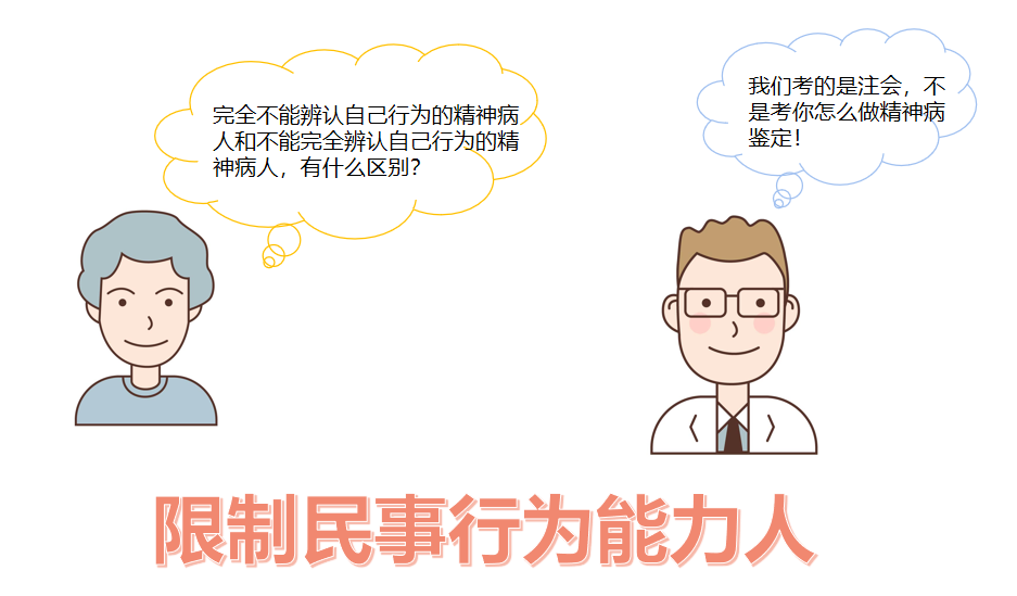 5.關(guān)于完全不能辨認(rèn)自己行為的精神病人和不能完全辨認(rèn)自己行為的精神病人,考生不要老是問(wèn)如何區(qū)分這兩種情況,我們考的是注會(huì),不是考你怎么做精神病鑒定。(限制民事行為能力人)
