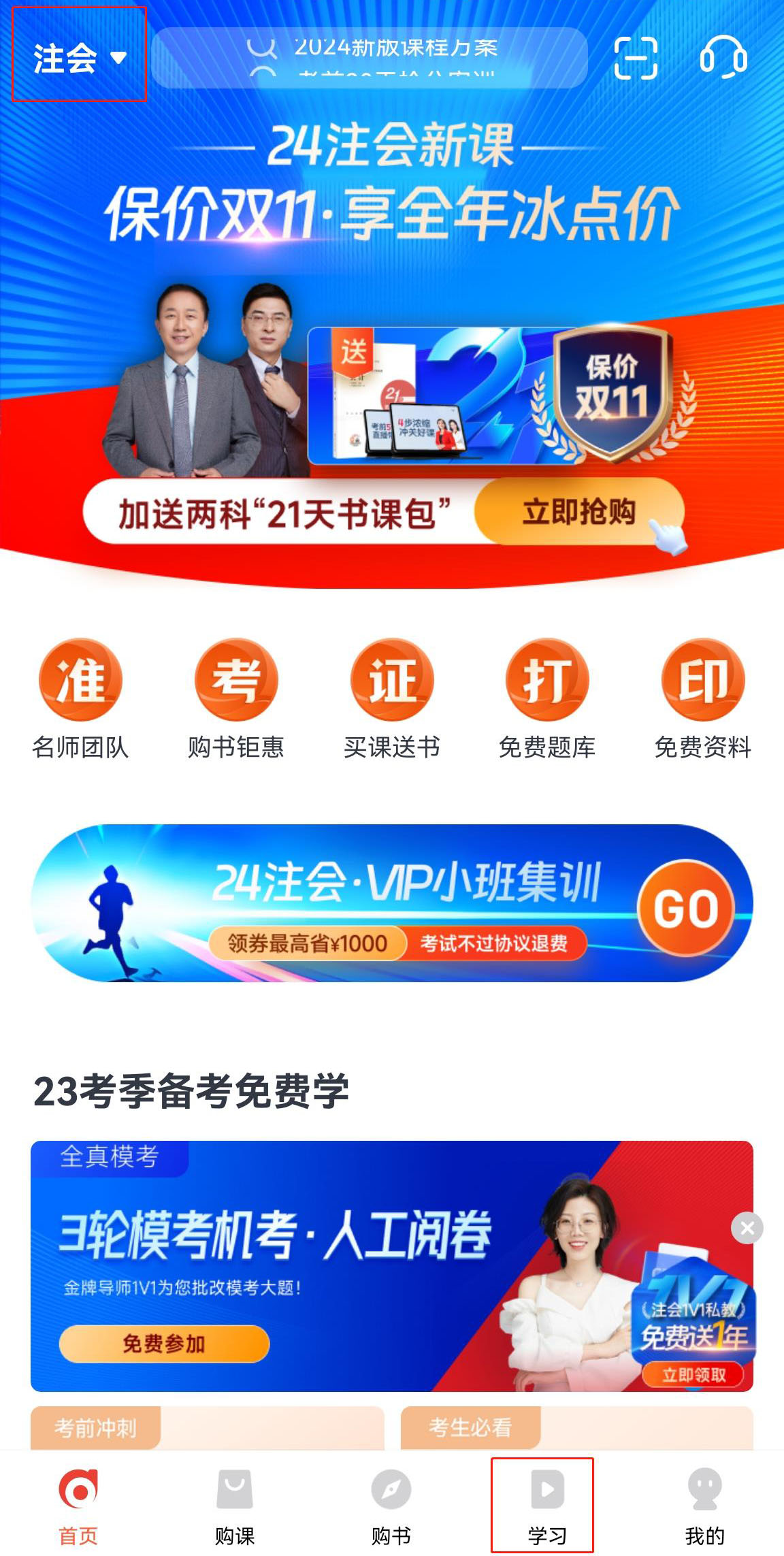 步驟一:登錄“會計(jì)云課堂”app,左上角選擇注會頻道,下方切換至“學(xué)習(xí)”頁面