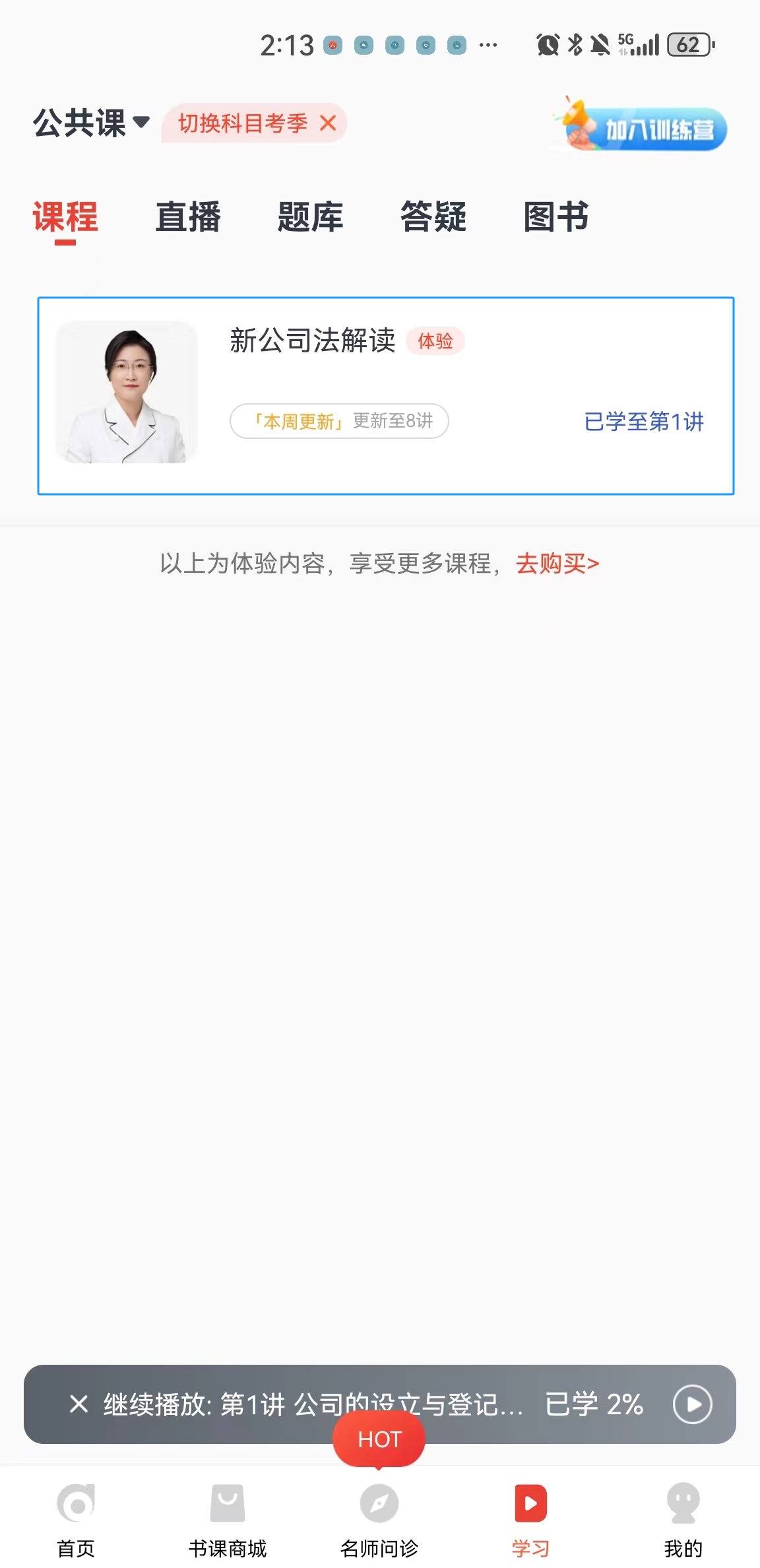 進入注冊會計師-公共課頁面后,可以直接看到黃潔洵老師主講的“新公司法解讀”課程,考生可以點擊卡片直接聽課,也可以點擊“課程目錄”查看該課程各講次目錄。