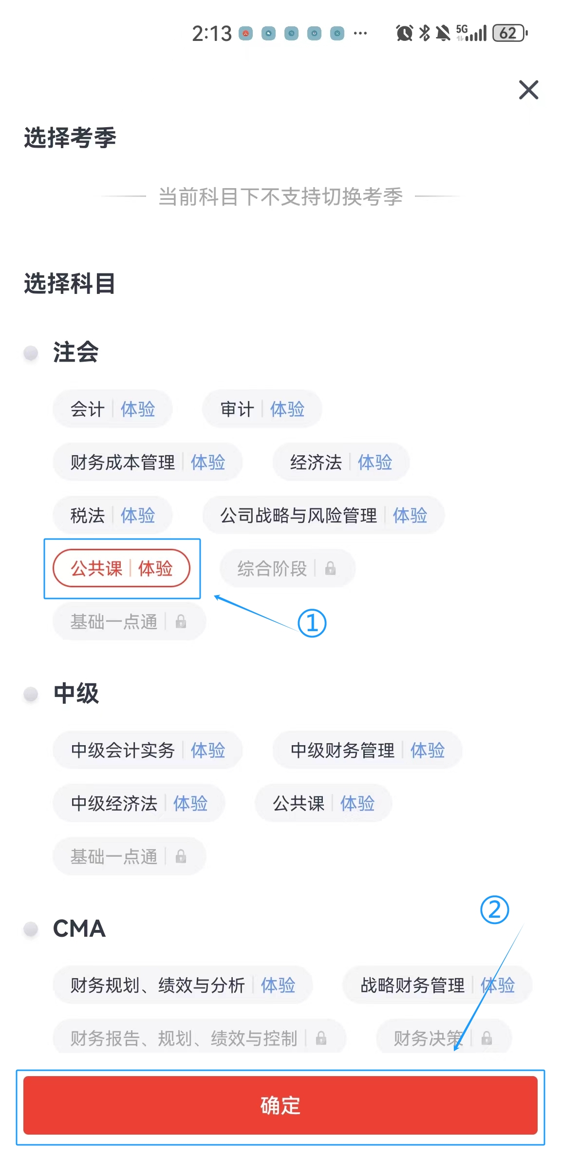 ▎步驟二:進入切換界面,選擇“注會-公共課”,點擊頁面下方的“確定”按鈕。