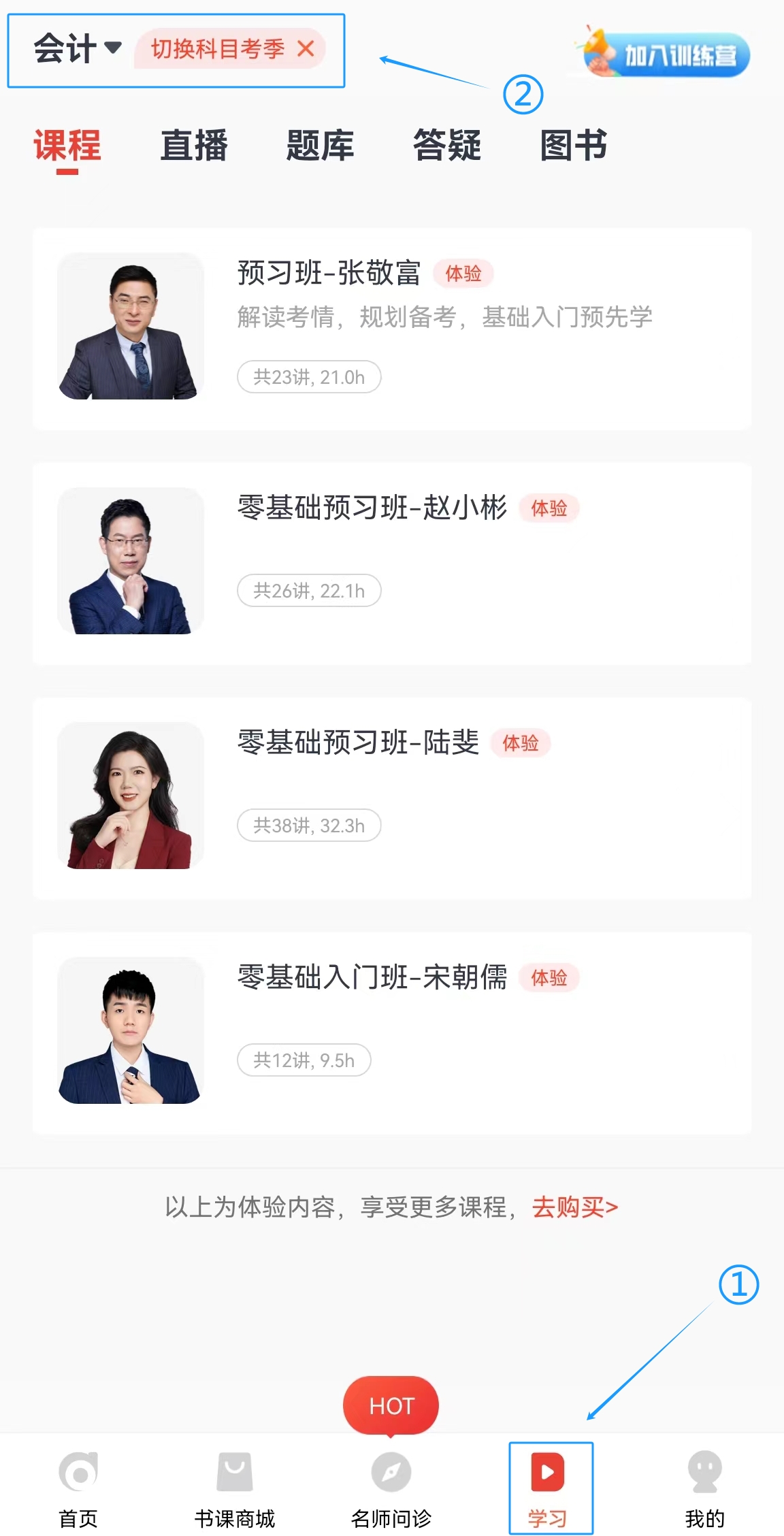 ▎步驟一:登錄/注冊個人賬號,點擊下方菜單中的“學習”按鈕,并在“學習”頁面上方切換科目考季。