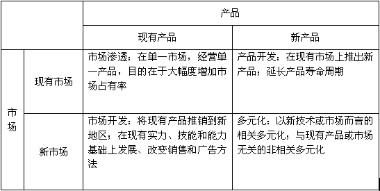 研究企業(yè)密集型戰(zhàn)略的基本框架,是安索夫的“產(chǎn)品-市場戰(zhàn)略組合”矩陣,見下表。