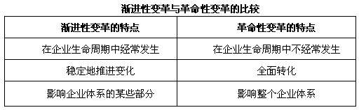 1.根據(jù)變革的程度不同,目前理論界比較普遍認(rèn)同的變革有漸進(jìn)性變革和革命性變革兩種。