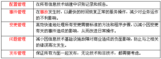 信息技術(shù)基礎(chǔ)設(shè)施庫(kù)通過規(guī)劃指導(dǎo)商業(yè)用戶,以商業(yè)需求來提供和管理信息技術(shù)服務(wù)的質(zhì)量。五個(gè)服務(wù)支持的流程和目標(biāo)是: