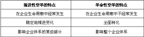 1.根據(jù)變革的程度不同,目前理論界比較普遍認(rèn)同的變革有漸進(jìn)性變革和革命性變革兩種。