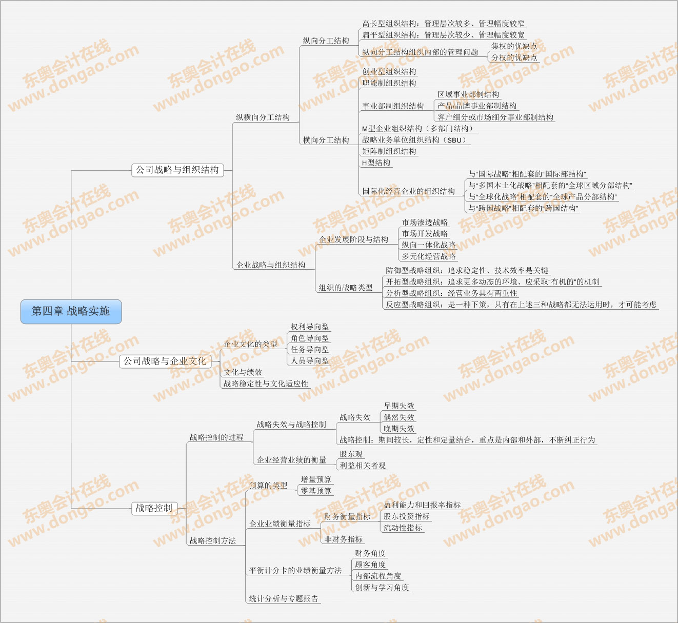 【東奧小編】2014年注冊(cè)會(huì)計(jì)師考試目前處于基礎(chǔ)備考階段,注會(huì)知識(shí)點(diǎn)繁雜細(xì)碎,想要全面掌握注會(huì)各科目的知識(shí),需要科學(xué)高效的學(xué)習(xí)方法,思維導(dǎo)圖正是一種非常適合注會(huì)復(fù)習(xí)的學(xué)習(xí)方法,正確利用思維導(dǎo)圖,不僅能使自己積極進(jìn)行知識(shí)點(diǎn)總結(jié),形成清晰的思路,還能對(duì)知識(shí)點(diǎn)進(jìn)行快速查漏補(bǔ)缺。以下是2014注會(huì)《公司戰(zhàn)略與風(fēng)險(xiǎn)管理》第四章戰(zhàn)略實(shí)施思維導(dǎo)圖: