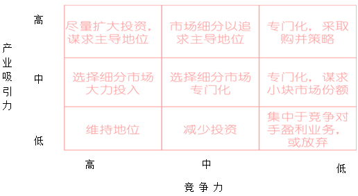 產(chǎn)業(yè)吸引力和競爭地位決定著企業(yè)某項(xiàng)業(yè)務(wù)在矩陣上的位置。
