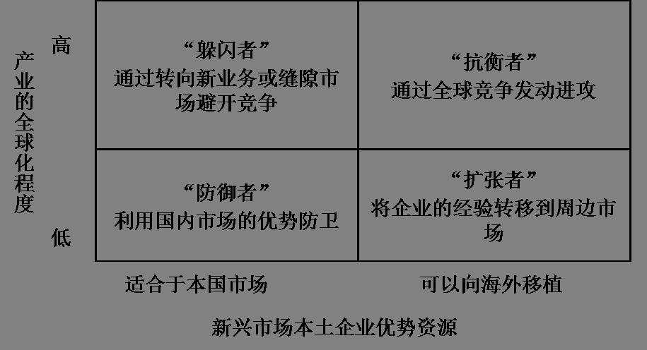 將產(chǎn)業(yè)所面臨的全球化壓力和新興市場本土企業(yè)可以轉移的資源作為兩個變量,作出下圖,可以用來指導公司戰(zhàn)略性的思考。
