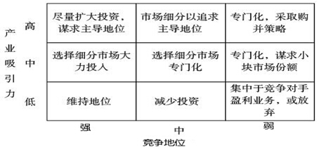 產(chǎn)業(yè)吸引力和競爭地位的值決定著企業(yè)某項業(yè)務(wù)在矩陣上的位置。