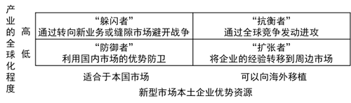 將產業(yè)所面臨的全球化壓力和新興市場本土企業(yè)擁有的優(yōu)勢資源作為兩個變量,做出下圖,可以用來指導公司戰(zhàn)略性的思考。