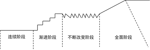漸進(jìn)性變革過程可以分為連續(xù)階段(修正)、漸進(jìn)階段(充實(shí))、不斷改變階段(完善)和全面階段(提高)四個(gè)階段。(見下圖)