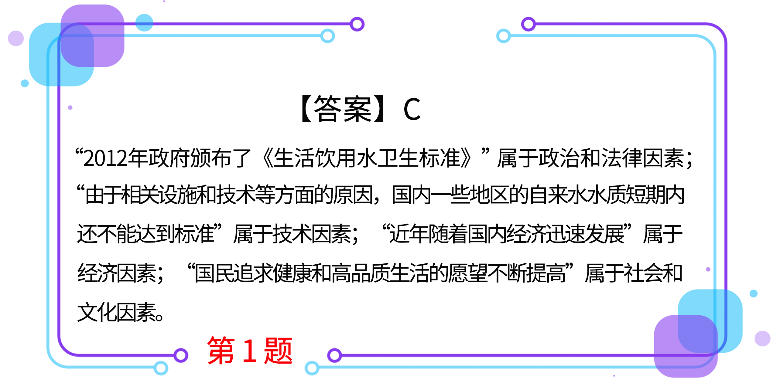 1.2012年政府頒布了《生活飲用水衛(wèi)生標準》。然而,由于相關(guān)設(shè)施和技術(shù)等方面的原因,國內(nèi)一些地區(qū)的自來水水質(zhì)短期內(nèi)還不能達到標準。同時,近年隨著國內(nèi)經(jīng)濟迅速發(fā)展,國民追求健康和高品質(zhì)生活的愿望不斷提高。通過對上述情況的分析,華道公司于2013年從國外引進自來水濾水壺項目,獲得成功。本案例中,華道公司外部環(huán)境分析所采用的主要方法是( )。(2019年)