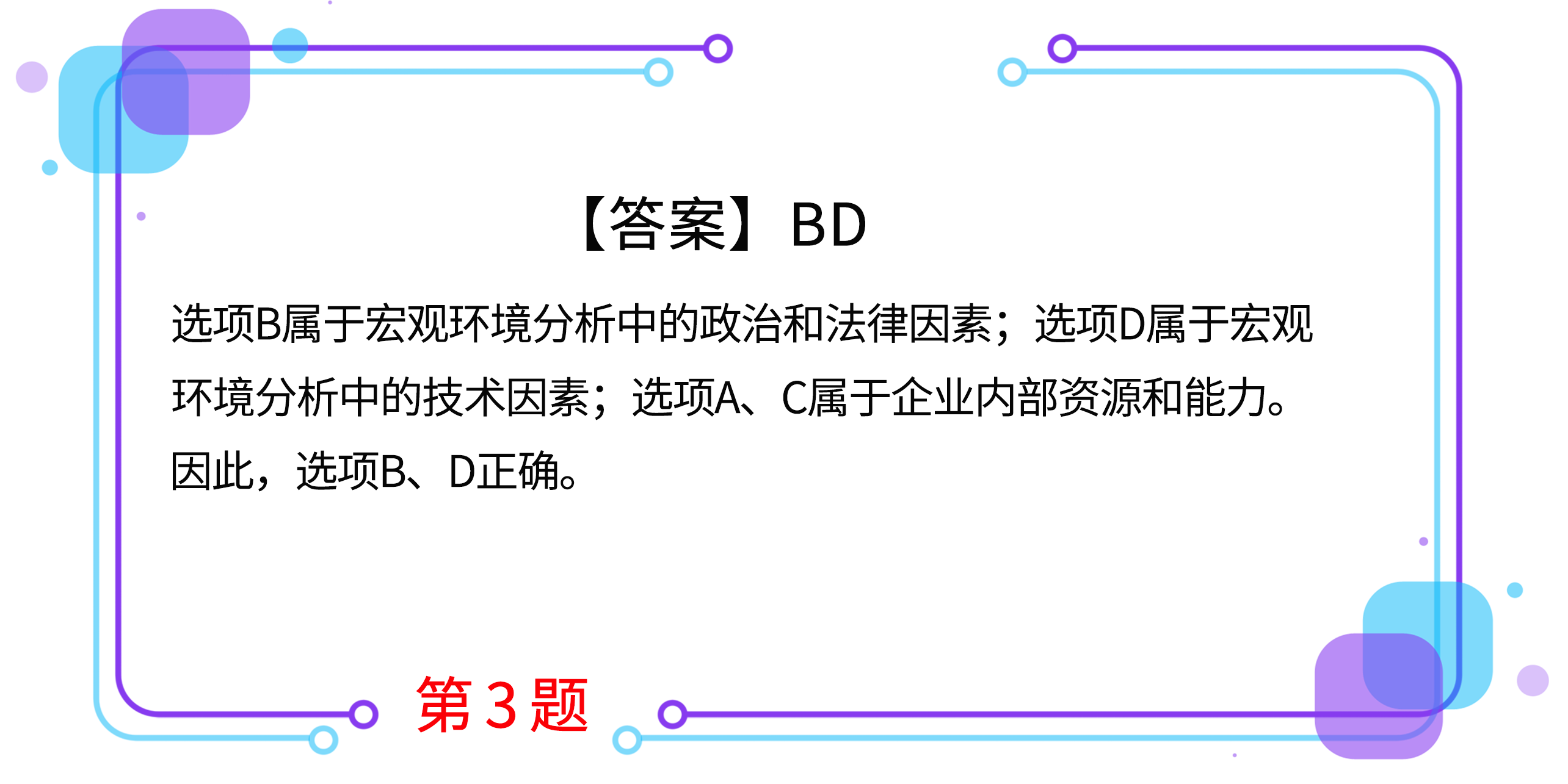 3.甲公司為國內(nèi)上市的電信公司。甲公司正在研究收購某發(fā)展中國家的乙移動通信公司。下列各項因素中,屬于甲公司在PEST分析中應(yīng)當考慮的有( )。