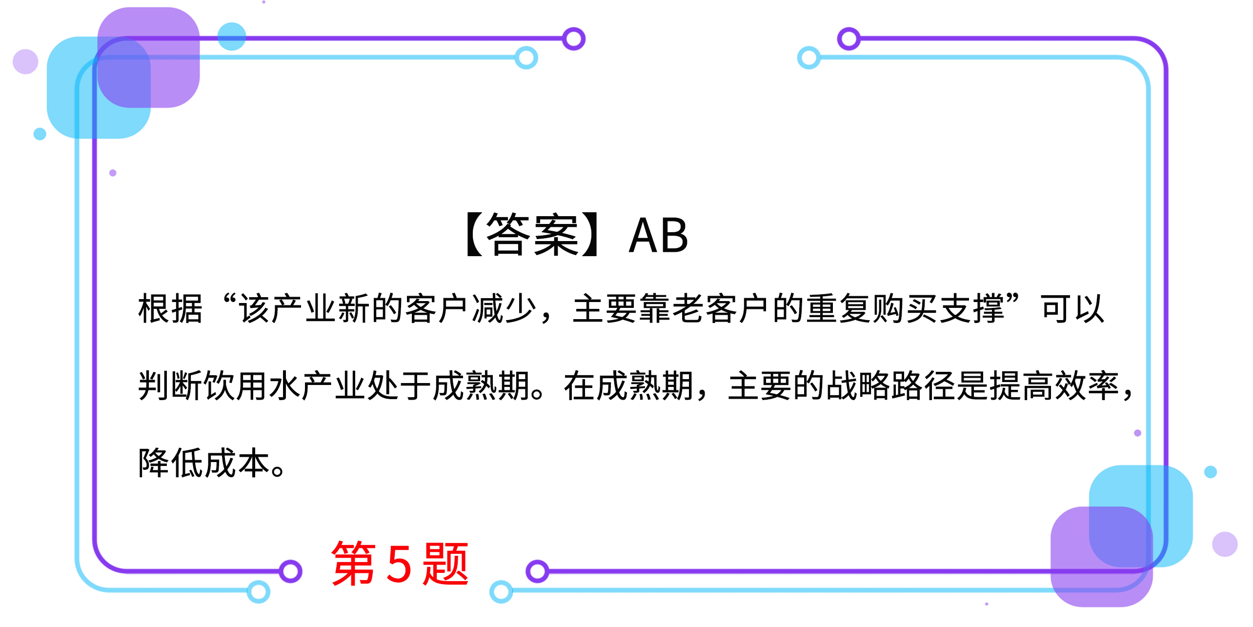 5.乙公司是一家集團(tuán)企業(yè),業(yè)務(wù)涉及金融、出版、飲用水、水泥生產(chǎn)等。公司管理層針對飲用水業(yè)務(wù)進(jìn)行分析時,發(fā)現(xiàn)該產(chǎn)業(yè)新的客戶減少,主要靠老客戶的重復(fù)購買支撐。對此,乙公司應(yīng)重點關(guān)注的有( )。