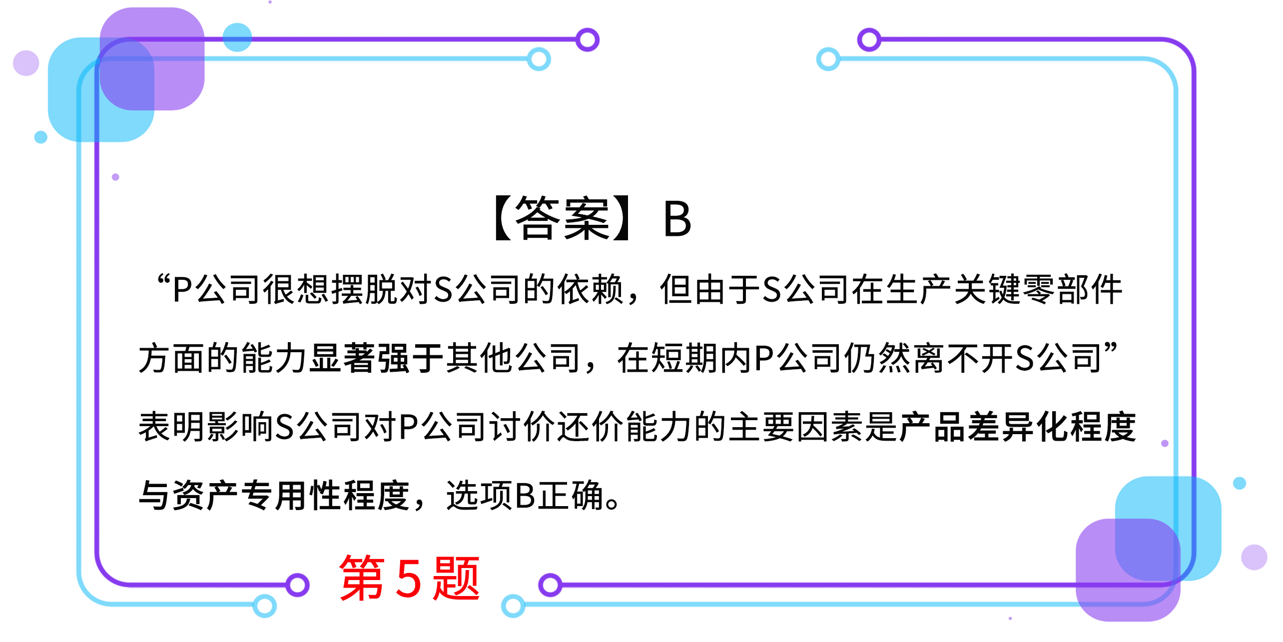 5.2007~2013年,S公司在作為P公司最大的元器件和閃存供應(yīng)商的同時(shí),推出了系列智能手機(jī)和平板電腦,成為P公司在智能手機(jī)和平板電腦市場(chǎng)主要的競(jìng)爭(zhēng)對(duì)手。P公司很想擺脫對(duì)S公司的依賴,但由于S公司在生產(chǎn)關(guān)鍵零部件方面的能力顯著強(qiáng)于其他公司,在短期內(nèi)P公司仍然離不開S公司。這一案例中,影響S公司對(duì)P公司討價(jià)還價(jià)能力的主要因素是( )。(2017年)