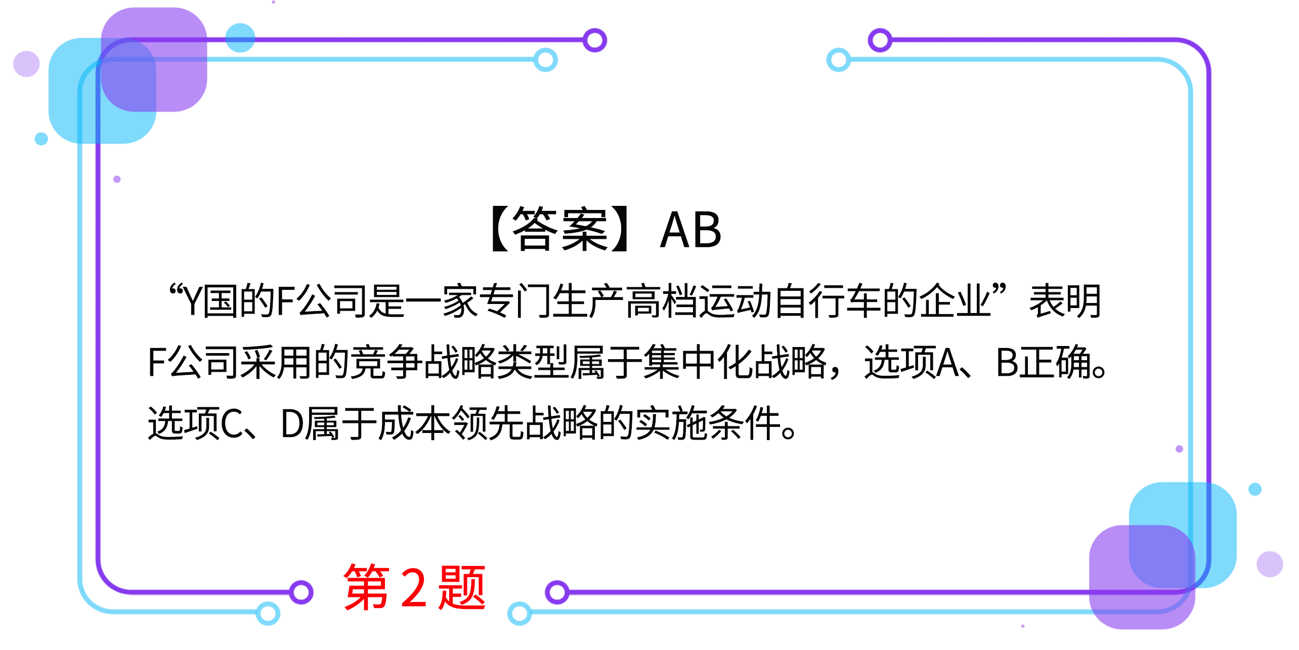 2.Y國的F公司是一家專門生產(chǎn)高檔運(yùn)動(dòng)自行車的企業(yè),其產(chǎn)品在Y國高檔運(yùn)動(dòng)自行車細(xì)分市場上的占有率高達(dá)80%以上。下列各項(xiàng)中,屬于F公司競爭戰(zhàn)略實(shí)施條件的有( )。(2017年)