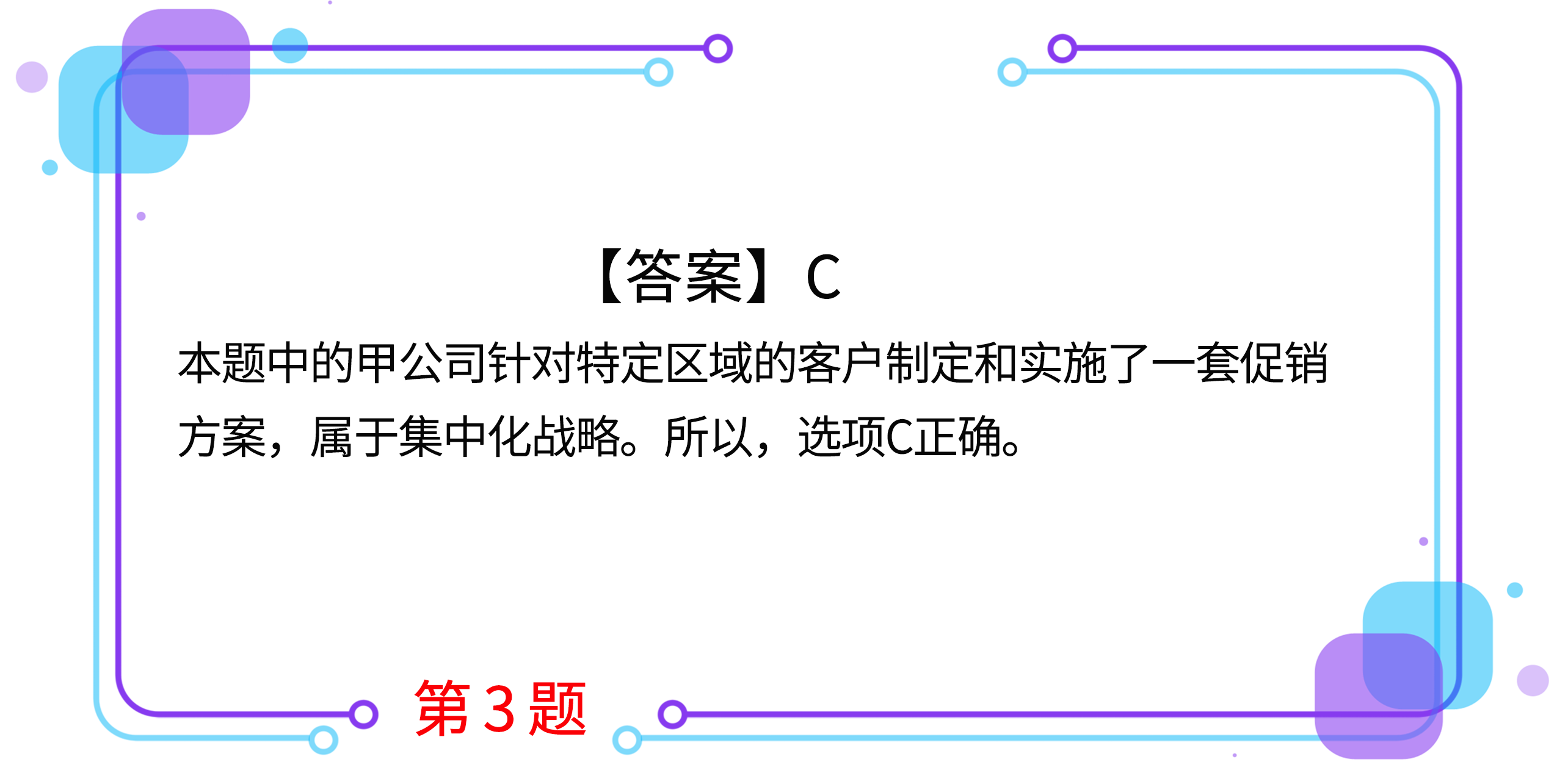 3.甲公司是一家餐飲外賣公司。該公司運(yùn)用大數(shù)據(jù)挖掘技術(shù),對(duì)某軟件園區(qū)的客戶訂餐行為進(jìn)行了深入調(diào)查,并根據(jù)調(diào)查結(jié)果,針對(duì)該區(qū)域的客戶制定和實(shí)施了一套促銷方案,取得了良好效果。甲公司實(shí)施的競爭戰(zhàn)略屬于( )。(2017年)