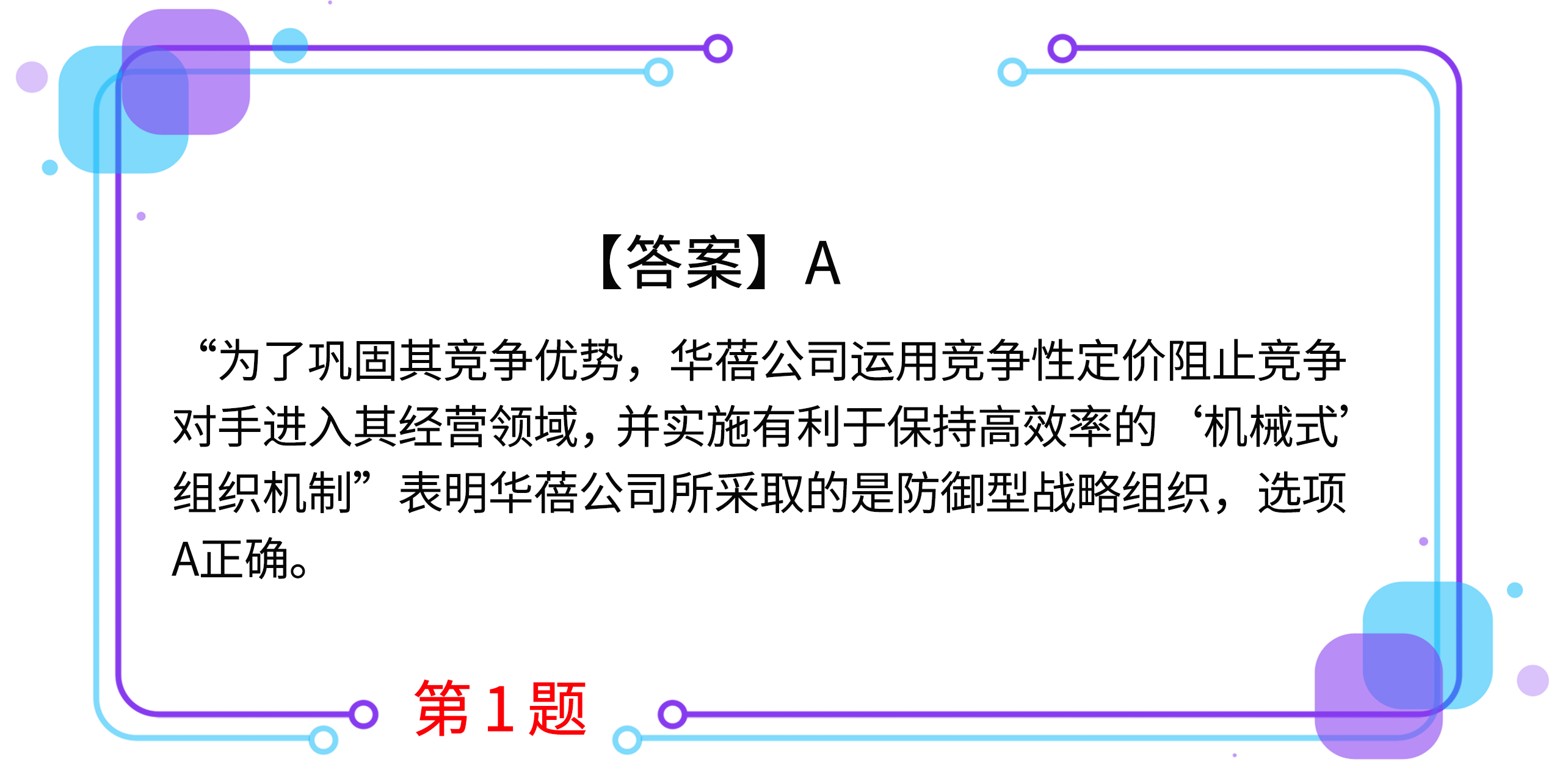 1.華蓓公司是Y市一家生產(chǎn)嬰幼兒用品的企業(yè)。多年來公司在Y市嬰幼兒用品市場擁有穩(wěn)定的市場占有率。為了鞏固其競爭優(yōu)勢,華蓓公司運(yùn)用競爭性定價(jià)阻止競爭對(duì)手進(jìn)入其經(jīng)營領(lǐng)域,并實(shí)施有利于保持高效率的“機(jī)械式”組織機(jī)制。華蓓公司所采取的組織的戰(zhàn)略類型屬于( )。(2019年)