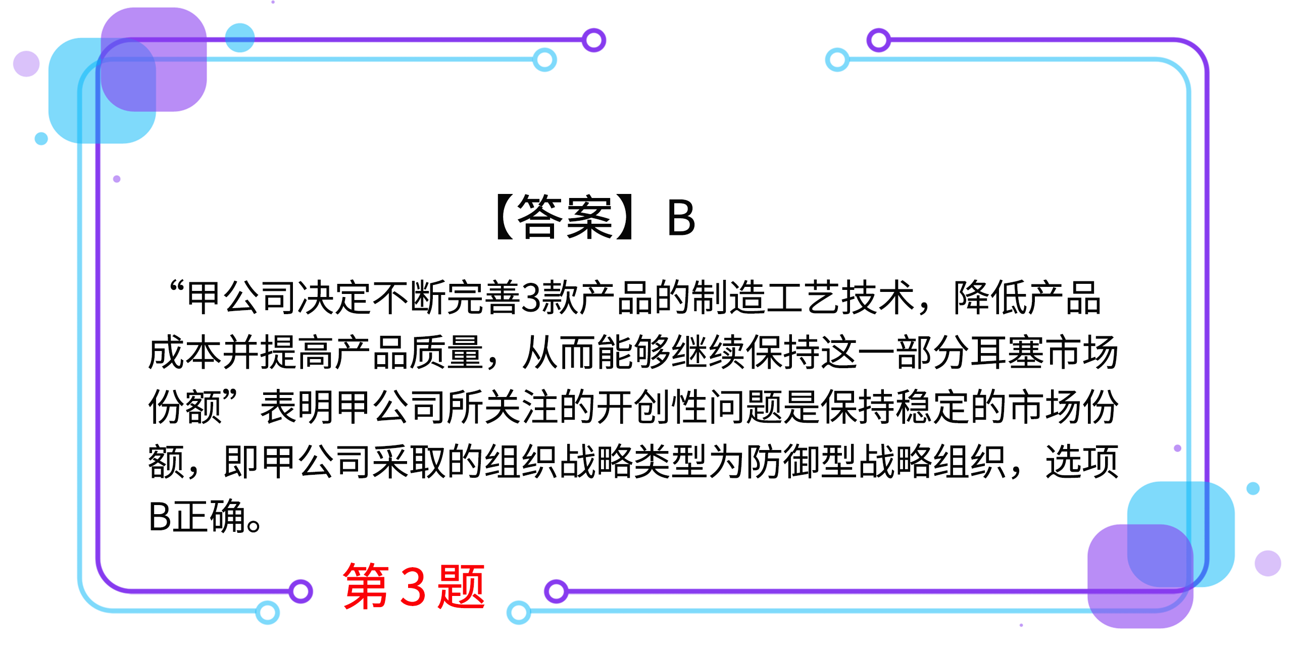 3.甲公司是研發(fā)音樂耳塞的企業(yè),其近期面向舞臺(tái)表演者和音樂發(fā)燒友推出的3款“入耳型”音樂耳塞產(chǎn)品,雖然外形并不時(shí)尚,但憑借著先進(jìn)的音頻技術(shù)和舒適的屏蔽感覺,得到了客戶的認(rèn)可,甲公司決定不斷完善3款產(chǎn)品的制造工藝技術(shù),降低產(chǎn)品成本并提高產(chǎn)品質(zhì)量,從而能夠繼續(xù)保持這一部分耳塞市場份額。甲公司宜采取的組織戰(zhàn)略類型為( )。(2014年)