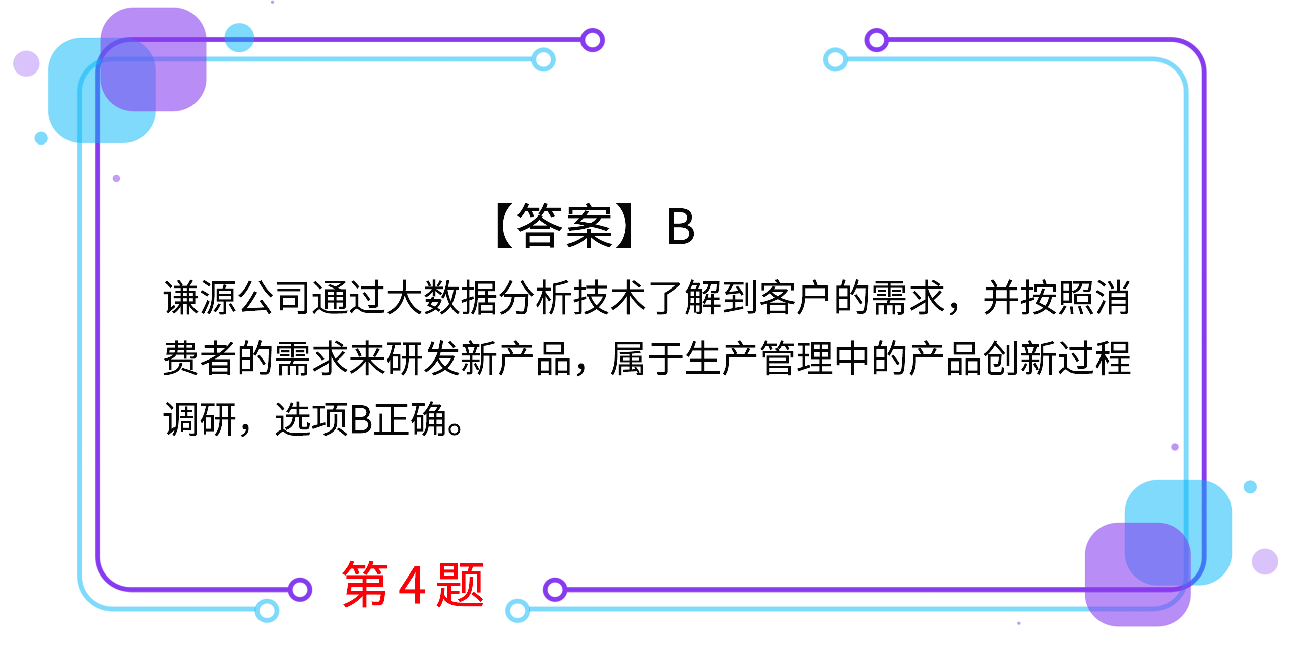 4.謙源公司是一家自行車生產(chǎn)企業(yè)。隨著人們環(huán)保意識(shí)的增強(qiáng),對(duì)于自行車的需求量漸漸增大。謙源公司通過大數(shù)據(jù)分析技術(shù)對(duì)自行車市場(chǎng)進(jìn)行調(diào)研,發(fā)現(xiàn)消費(fèi)者目前最在意的是自行車的停放問題,多數(shù)消費(fèi)者家中沒有停放位置。謙源公司因此研發(fā)出多款可以折疊的自行車,而且材質(zhì)較輕,安置方便。謙源公司運(yùn)用大數(shù)據(jù)分析影響的企業(yè)戰(zhàn)略轉(zhuǎn)型的主要方面是( )。