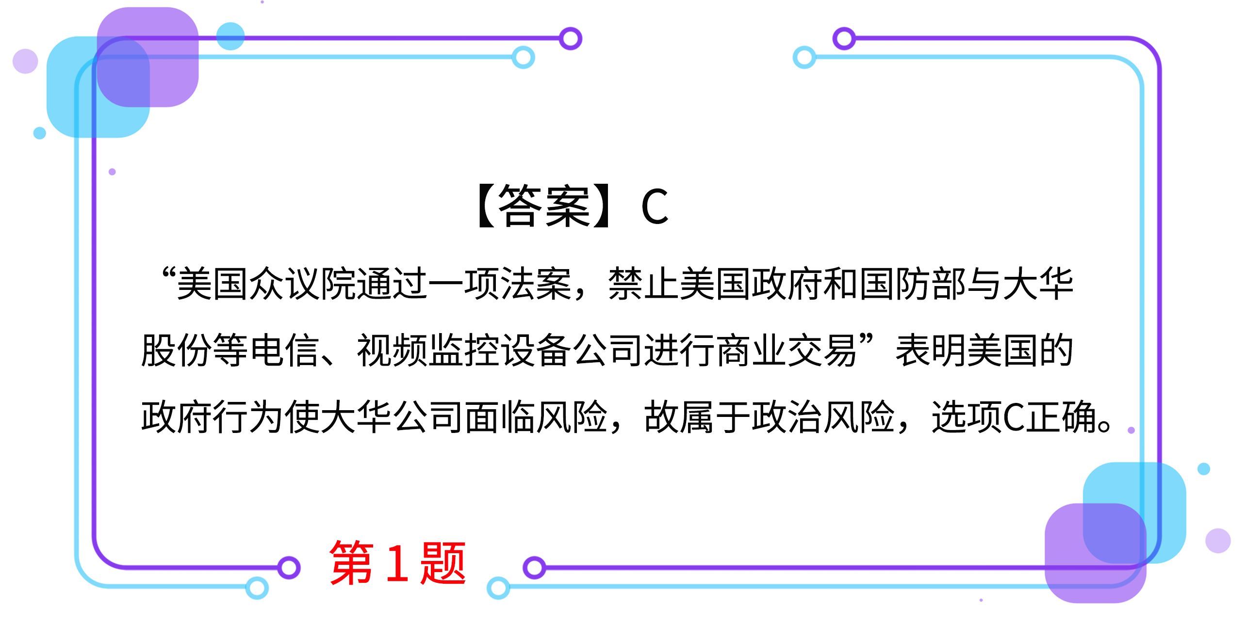1.2018年5月28日美國眾議院通過一項法案,禁止美國政府和國防部與大華股份等電信、視頻監(jiān)控設(shè)備公司進行商業(yè)交易。在上述案例中,大華公司面臨的風(fēng)險是( )。