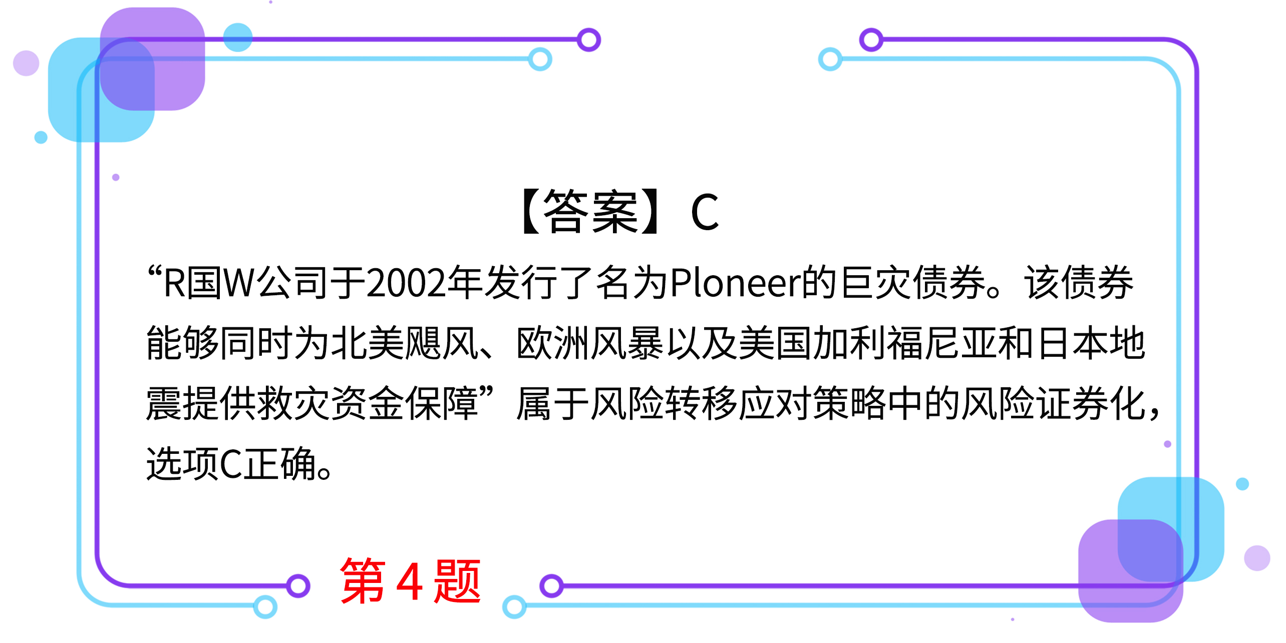 4.R國W公司于2002年發(fā)行了名為Ploneer的巨災債券。該債券能夠同時為北美颶風、歐洲風暴以及美國加利福尼亞和日本地震提供救災資金保障。這種具有金融衍生品特性的債券,屬于風險管理策略工具中的( )。(2016年)