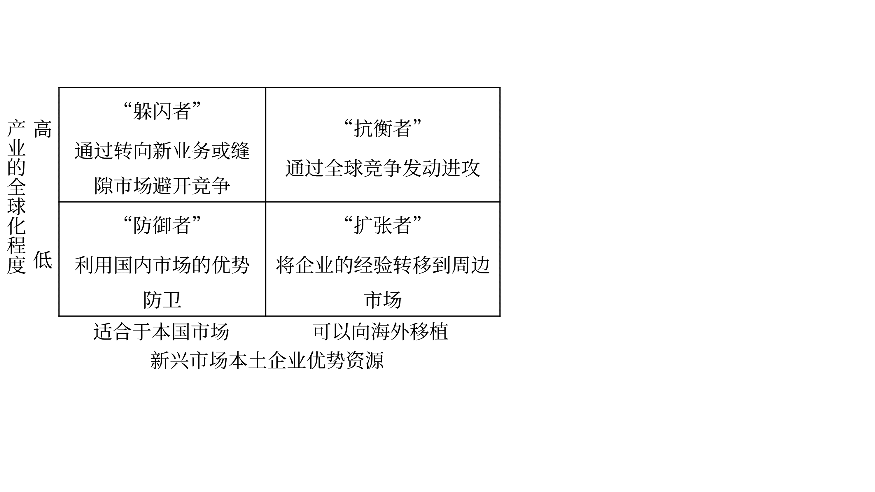 將產(chǎn)業(yè)所面臨的全球化壓力和新興市場(chǎng)本土企業(yè)擁有的優(yōu)勢(shì)資源作為兩個(gè)變量,作出下圖,可以用來(lái)指導(dǎo)公司戰(zhàn)略性的思考。
